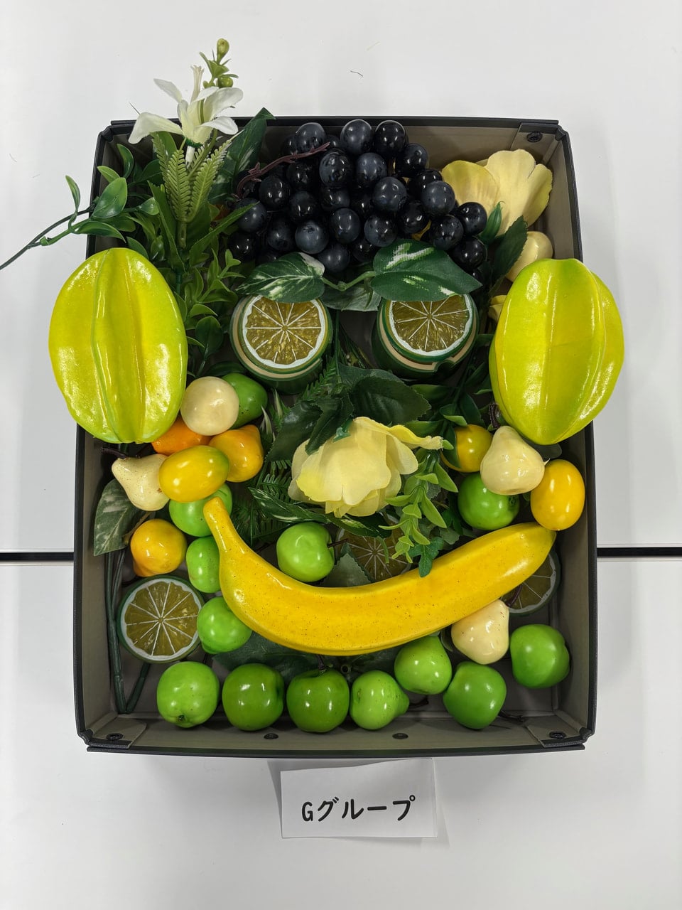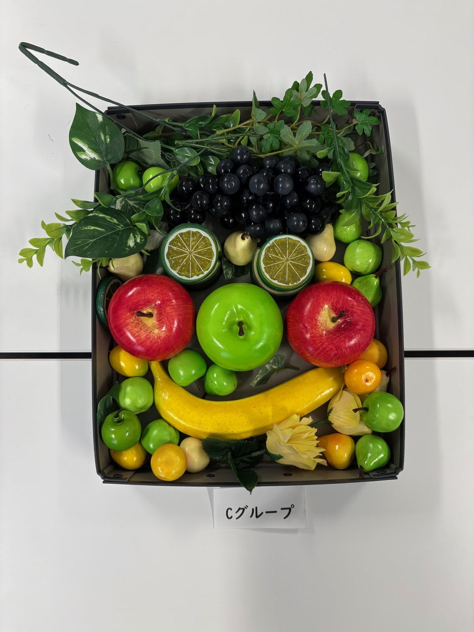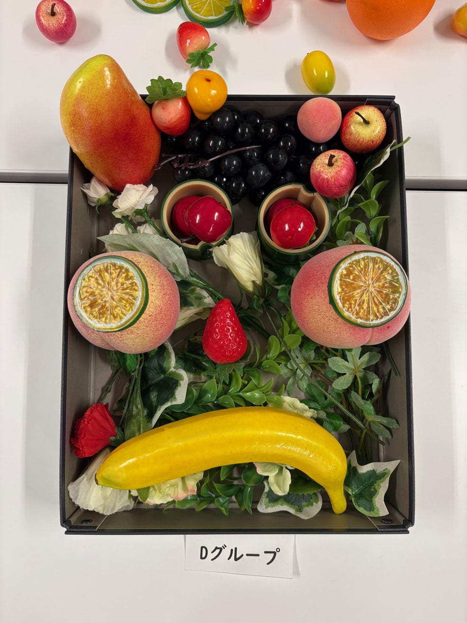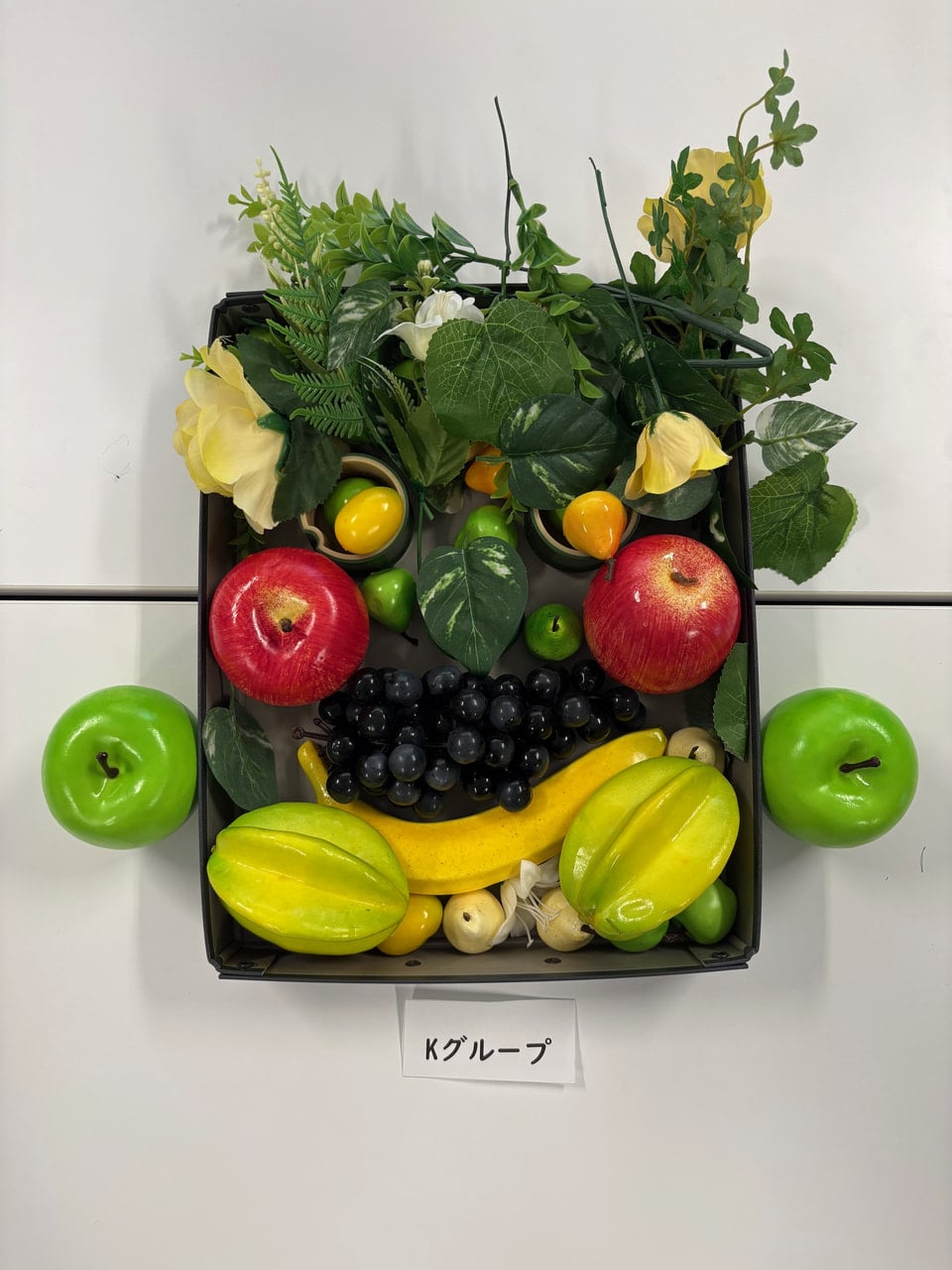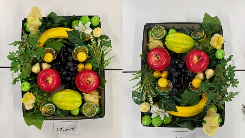 ・実際に取り組んでみて、意外とどの果物でも顔には見えましたが、果物や置く場所によって顔の印象が変わるのが面白いと思いました。使う素材は一緒のはずなのに、グループによって全く違う顔を作ることができるのがとても興味深かったです。
