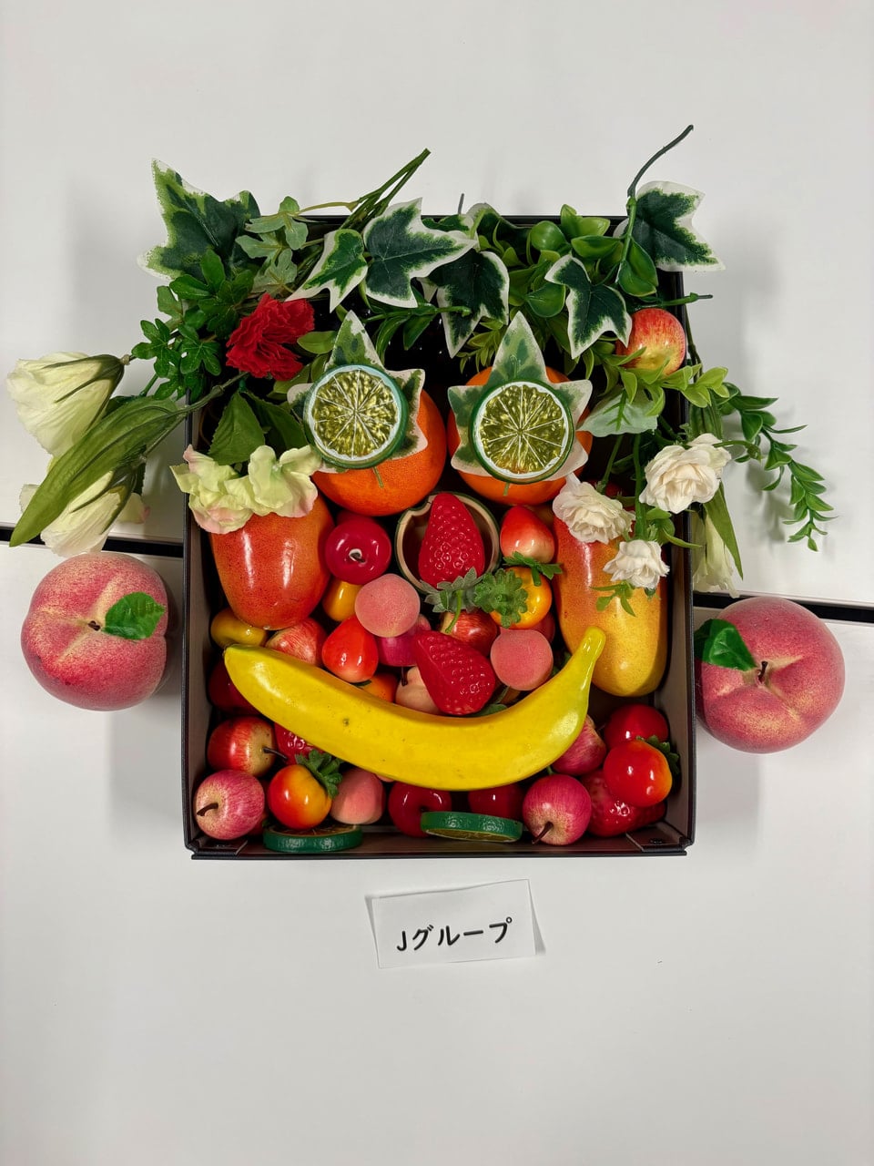 Jグループこだわりポイント:オレンジの上にまつ毛代わりの葉をのせて、その上にライムを載せて目をクリっとさせました。葉っぱで髪の毛に見えるようにたくさんのせてフサフサにしました。マンゴーを顔の横においてほっぺに見えるようにしました。