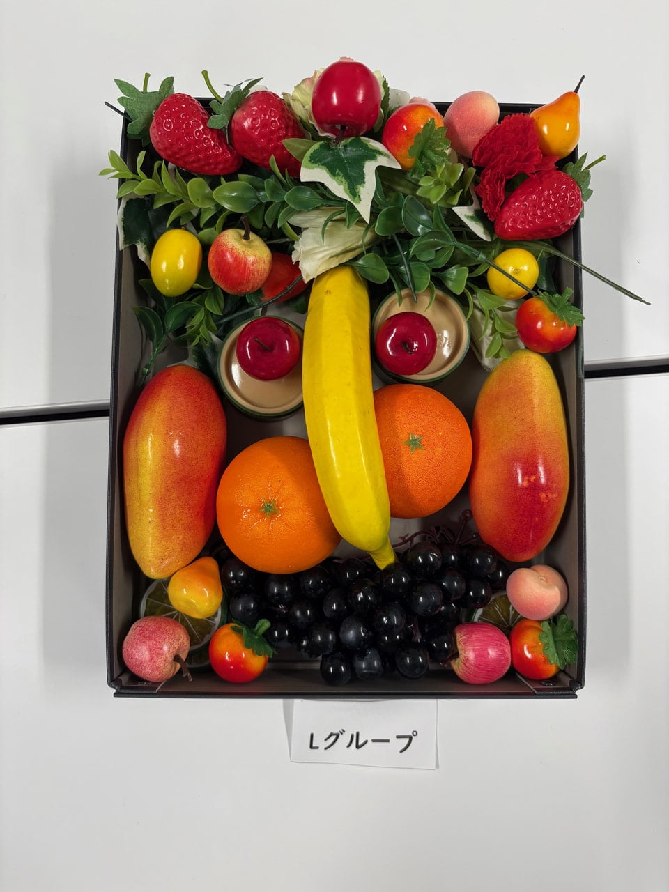 Lグループこだわりポイント:目を目立たせるために高さを出しました。髪の毛に飾りをつけて華やかにしました。葡萄をつかって口と髭を表現しました。