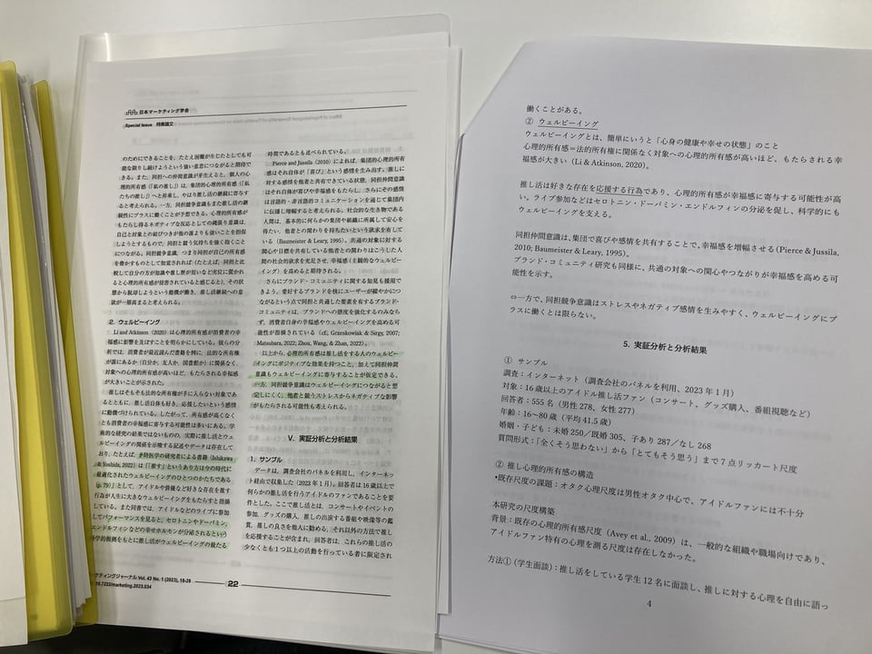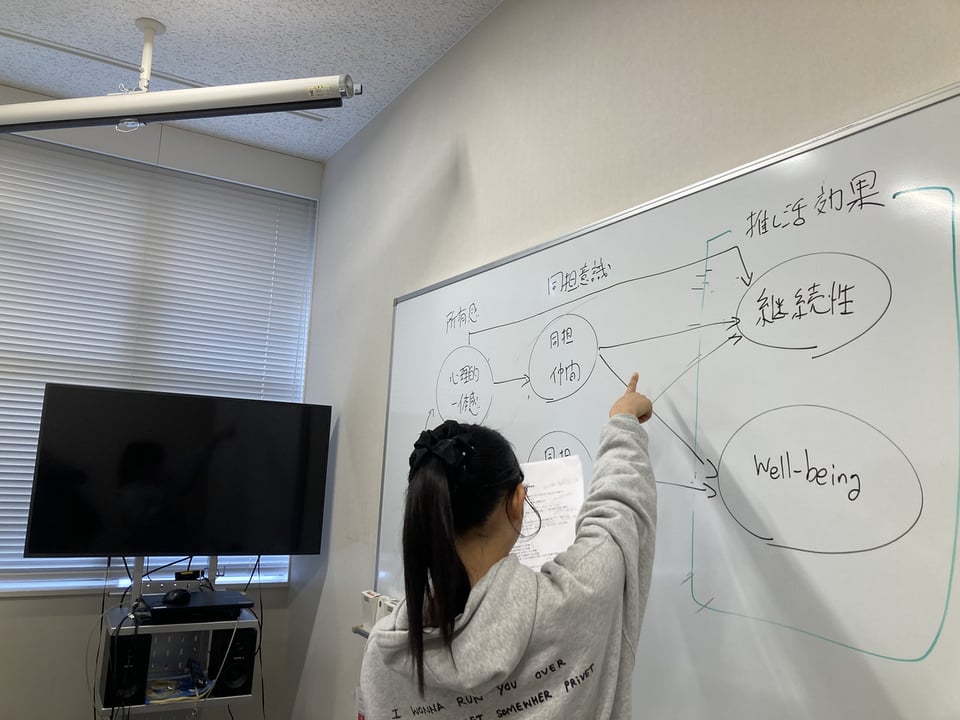 この論文は,アイドル(推し)への気持ち(心理的所有感)を,心理的一体感(“推し”は自分の一部!),と,心理的責任感(“推し”を育てている!)にわけ,それらが,同担への気持ち(同担仲間意識と,同担競争意識)を介して,推し活の継続性とウェルビーイングに与える影響について調査したものです。