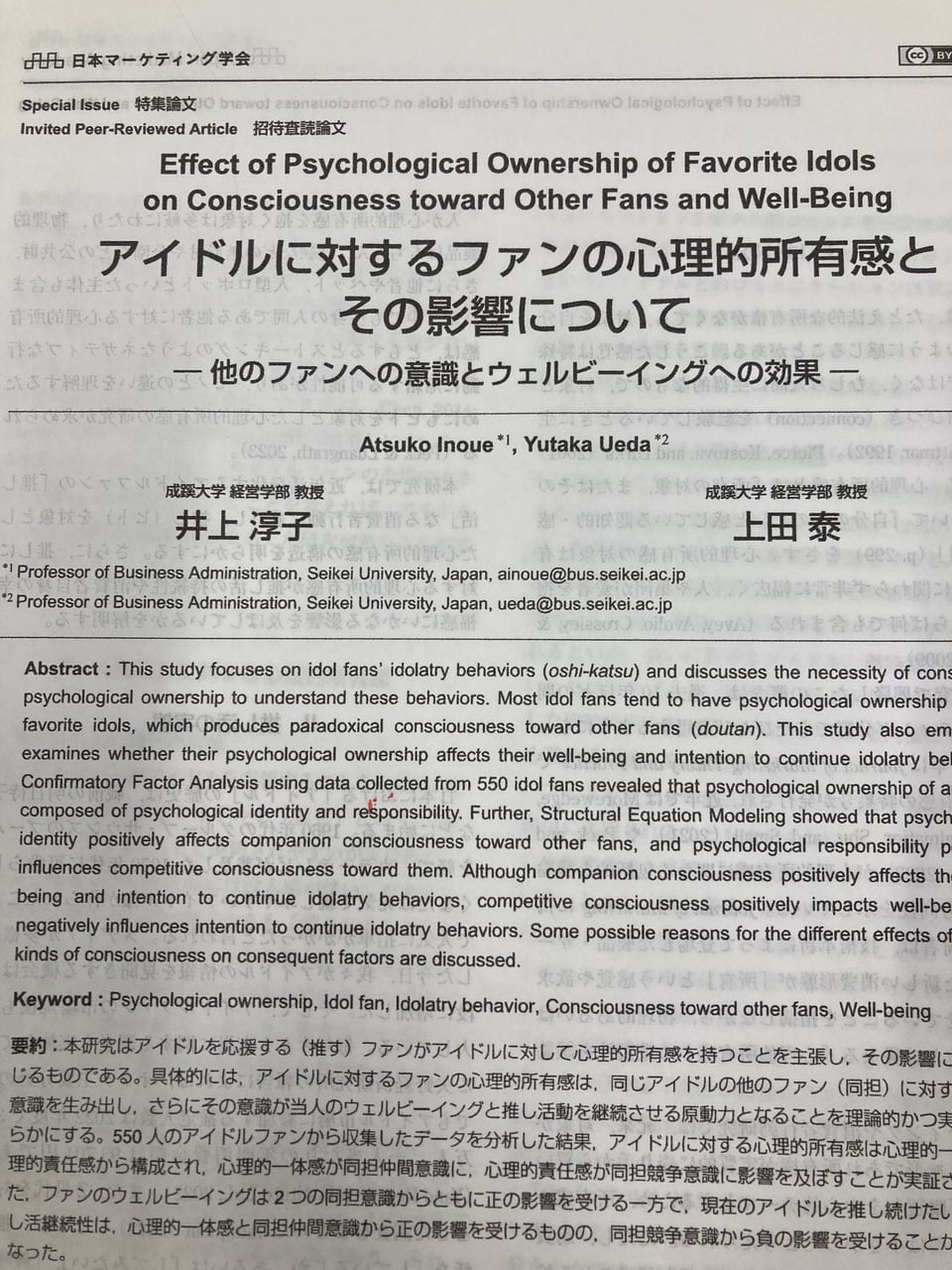 井上・上田(2023)アイドルに対するファンの心理的所有感とその影響について―他のファンへの意識とウェルビーイングへの効果―,日本マーケティング学会誌