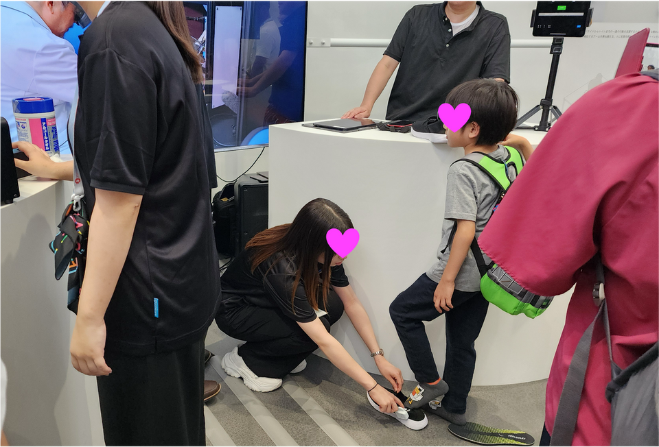 歩行を計測して評価するシステムの方では、来場者の方に足のサイズをお聞きして、該当するサイズの計測用のデバイス(スニーカー)をお渡しした後、計測のための歩行の教示を行いました。スニーカーのサイズが限られているため、小さなお子さんやとても大きな足の方が来た場合は、計測に参加できない旨を説明しながらとても申し訳ない気持ちになることもありましたが、みなさん笑顔で理解してくださるのがとても印象的でした。歩行評価では、歩行年齢やどんな歩行かということがわかるので、私たちもチャレンジしてみたのですが、全員実年齢よりもかなり高い年齢となるというかなり屈辱的な結果となりました(上田先生は実年齢より若かったとのことで、すごく喜んでいました笑)。