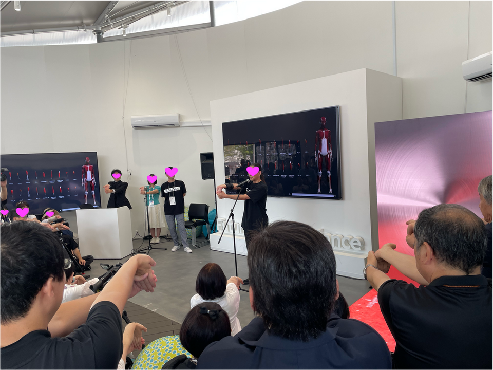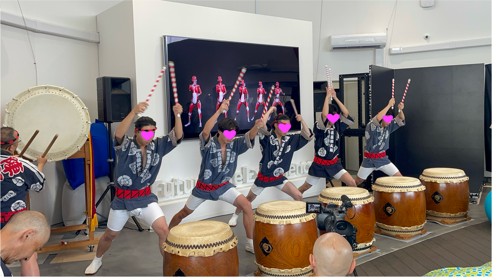 ふたつめのイベントは(9月2日)、長篠陣太鼓保存会の公演で、「清流流れ打ち」「合戦太鼓」など5曲を披露するものでした(讀賣新聞オンライン 2025/8/2 掲載記事「長篠陣太鼓きょう万博で 名大の技術 筋肉の動き映像に」)。演奏に合わせて、メンバー1人の筋肉などの動きをCG化した映像が映し出されました。こちらも立ち見が出るほどの大盛況で、初めて間近で目にする長篠陣太鼓の音は、耳だけでなくあたかも全身で聞いているような、大迫力の経験となりました。