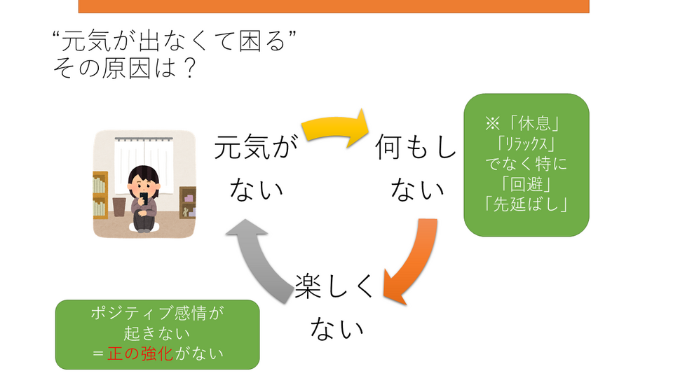 心理学的支援法Ⅰの、今回の授業テーマは、認知行動療法のアプローチのひとつである「行動活性化(Behavioral Activation)」でした。