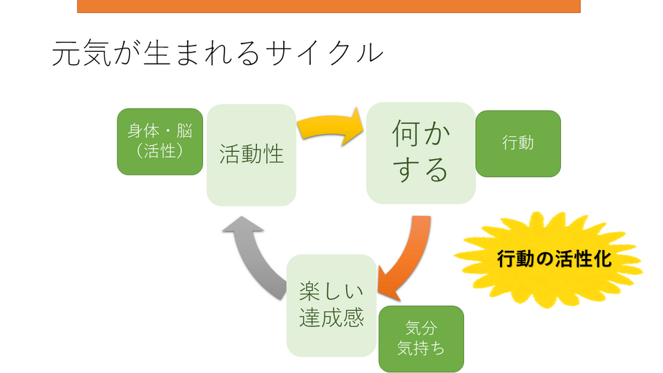 行動活性化では、このスパイラルを変化させるために、気分が沈んでいるときでもできそうな、小さな「行動」から始めることを重視します。