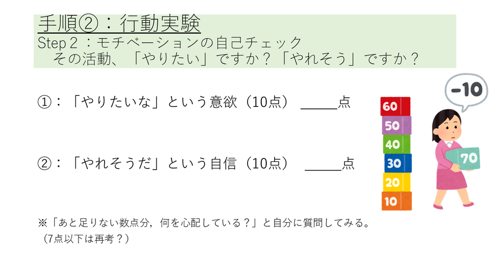 来週の授業では、それぞれの「行動実験」の結果を報告してもらいます。
