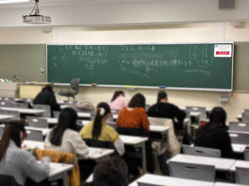 社会・集団・家族心理学Ⅰは、公認⼼理⼠資格の取得のために履修が必要とされている授業です。この授業では、ヒトを他の動物と比較した際に際立つ特徴の一つである「社会性」に着目し、社会心理学の視点から、人の心と社会との関係について学んできました。特に、個人の認知や感情、対人関係、集団、文化といった多層的な水準から、人の意識や行動がどのように形成され、相互に影響し合っているのかを扱ってきました。毎回の授業では、テキストを中心にして様々な社会心理学の理論や研究が紹介されますが、公認心理師試験によく出題される用語や概念についても触れるようにしています。