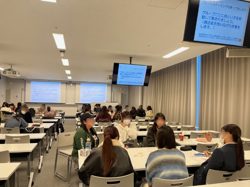 初めましての人もいるグループで作成するので皆さん初めは少し緊張していますが、次第に話が深まっていきます。(就活ではこういったグループワークがある企業もあるので、その練習にもなるかなと思います)