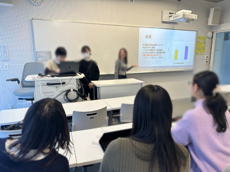 実験参加者の募集や実施は初めてのことばかりで試行錯誤の連続でしたが、「ここが面白そう!」「この条件を追加してみよう」とメンバー同士で相談しながら進める時間はとても新鮮でした。最終発表では、初めて聞く人にも結果が伝わるよう、図や具体例を工夫したスライドを作成し、大きな達成感を得ることができました。
