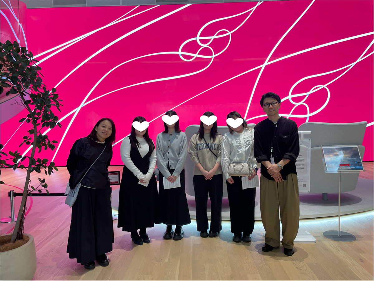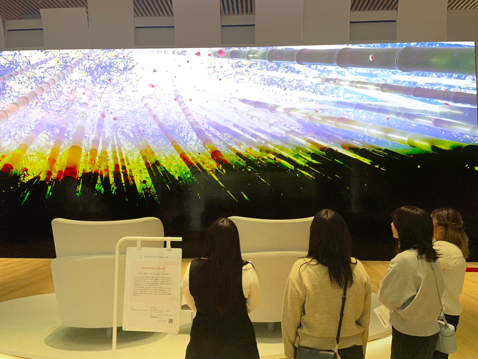さらに今回は、16Kの大画面を有する「Beauty Retreat Theater(ビューティー・リトリート・シアター)」も見学しました。ここでは、「見るだけで美しくなれる」ことを目指して開発された、畏敬の感情を引き起こす映像コンテンツを体験しました。加えて、開発者であるみらい開発研究所の岡﨑俊太郎先生から直接お話を伺うこともできました。授業の中でAWE(畏敬)体験について聞いたことはありましたが、実際に自分で体験するのは今回が初めてでした。映像のスケール感や没入感は想像以上で、ただ「きれい」「すごい」というだけではない、不思議な感動がありました。知識として知っていた概念が、実際の体験を通してぐっと身近なものになり、とても勉強になりました。