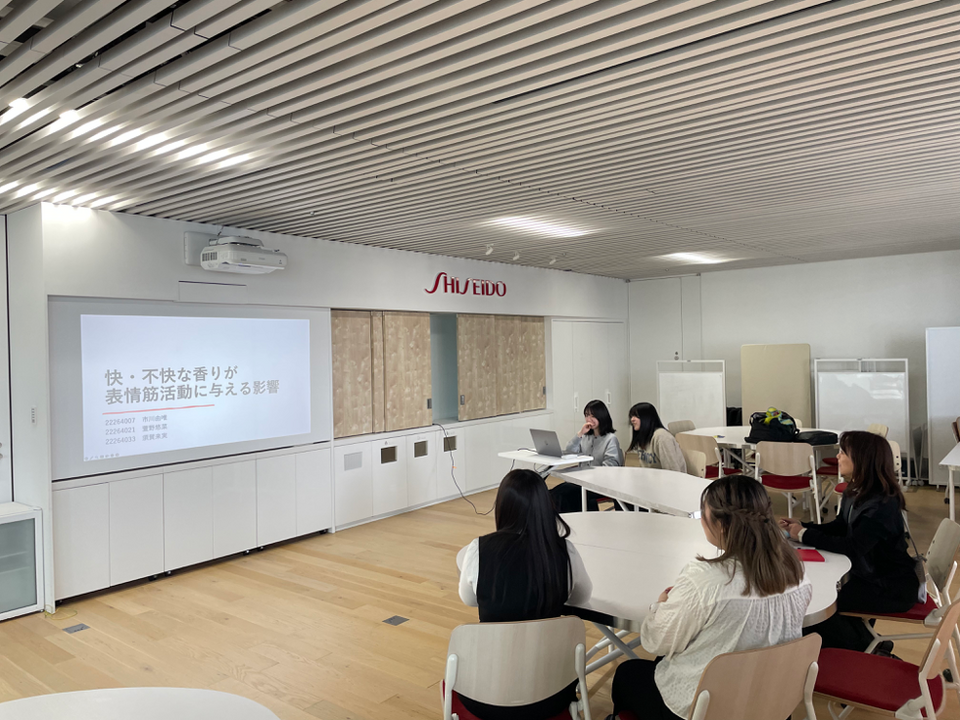 卒業式の直前というタイミングで、自分たちの研究成果を学外で発表し、さらに香りや美、感性に関わる最前線の取り組みに触れられたことは、私たちにとって本当に貴重な経験でした。研究の面白さを改めて感じると同時に、社会の中で感性や美に関する知がどのように活かされているのかを実感する一日にもなりました。これから社会人という次のステージに進んでいきますが、今回の経験はきっとこれから先にもつながっていくと思います。卒業前にこのような機会をいただけたことに感謝しつつ、上田ゼミで学んだことをそれぞれの未来に活かしていきたいです。