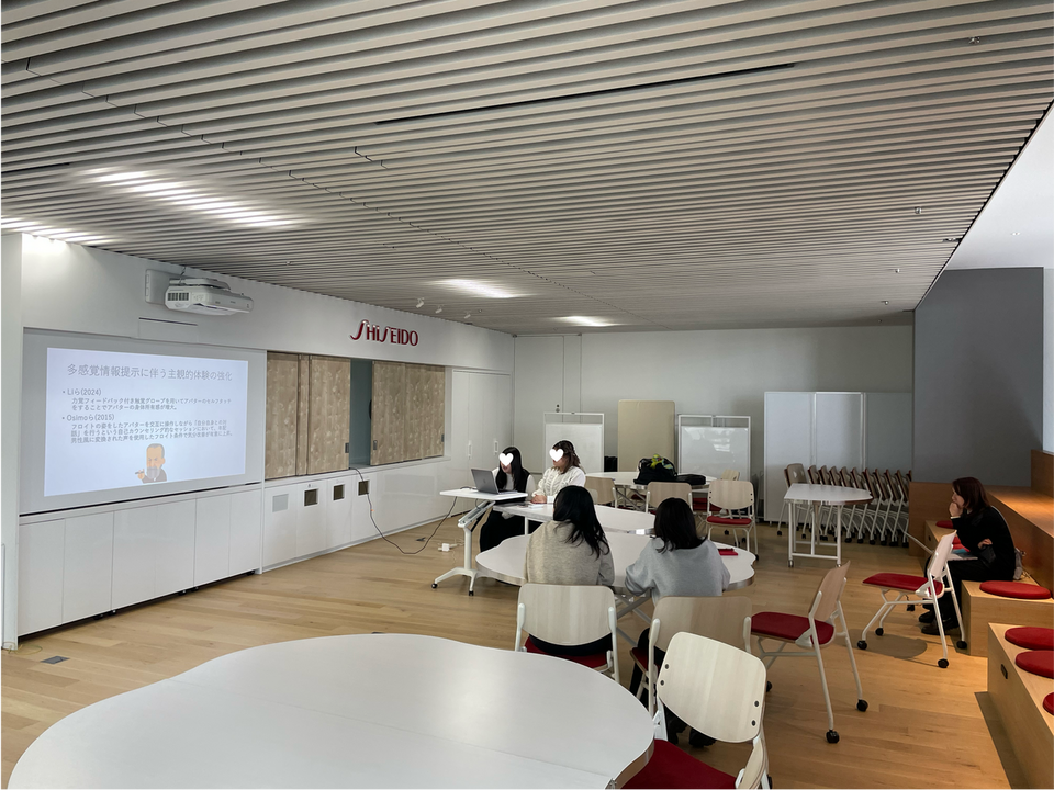 発表を聞いてくださったのは、上田先生の「感性芸術情報心理学Ⅰ」の授業でもゲストスピーカーとしてもお越しくださっている、資生堂みらい開発研究所の山南春奈先生です。香り研究に実際に携わってこられた先生ならではの視点から、香りの選び方や研究の今後の広がりについて、とても示唆に富んだアドバイスをいただきました。自分たちの研究を丁寧に受け止めていただけただけでなく、これから後輩たちに引き継いでいくうえでも大きなヒントになるお話ばかりで、本当に有意義な時間になりました!